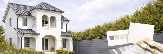 3 combinații cromatice recomandate pentru exterior (fațadă + acoperiș + gard)