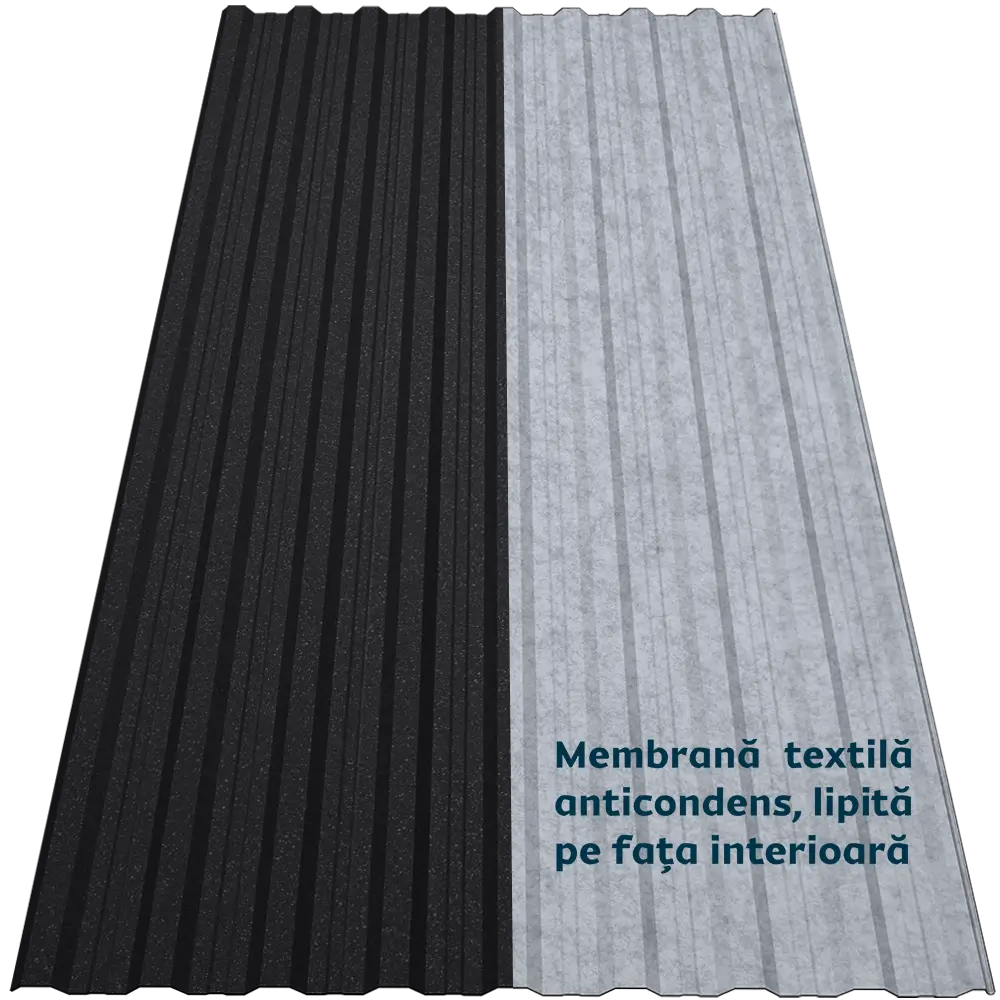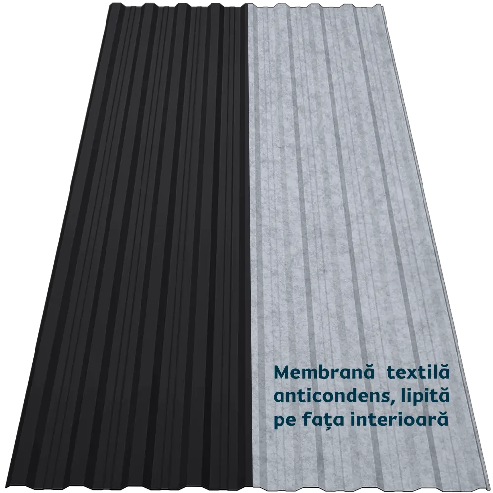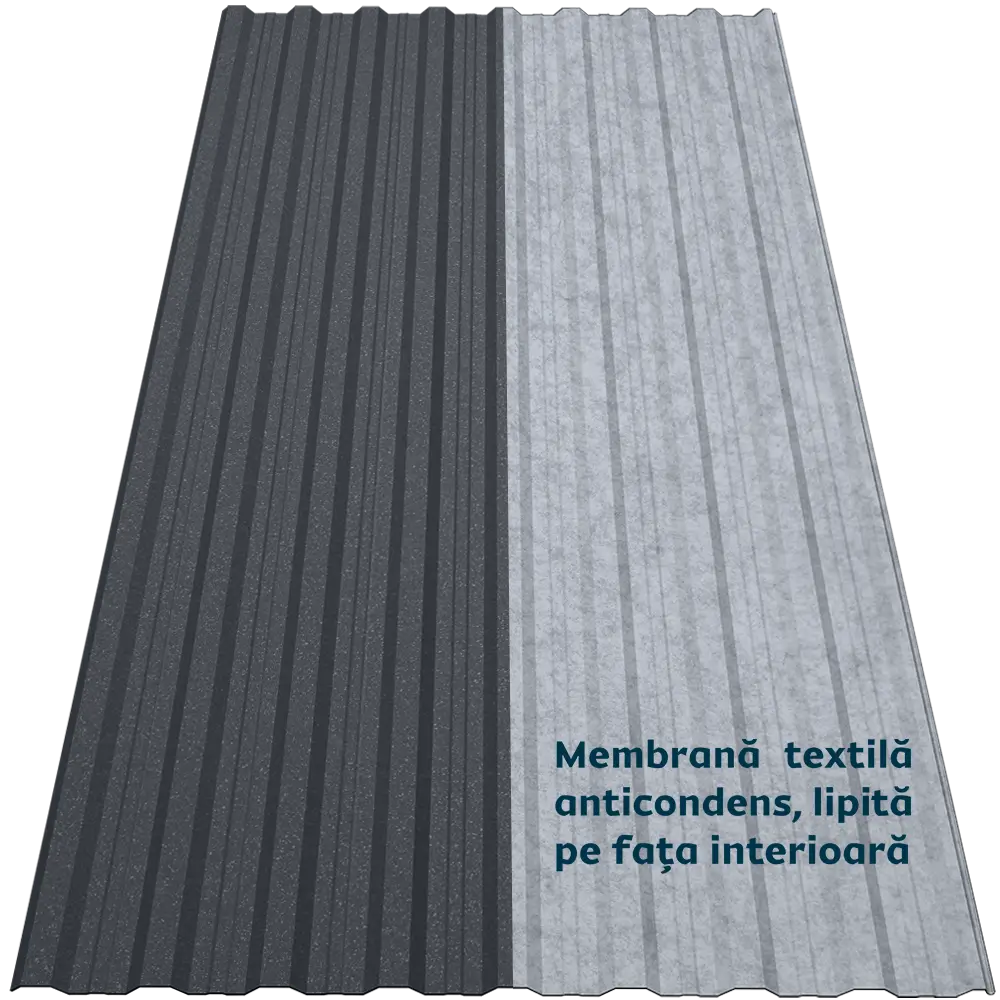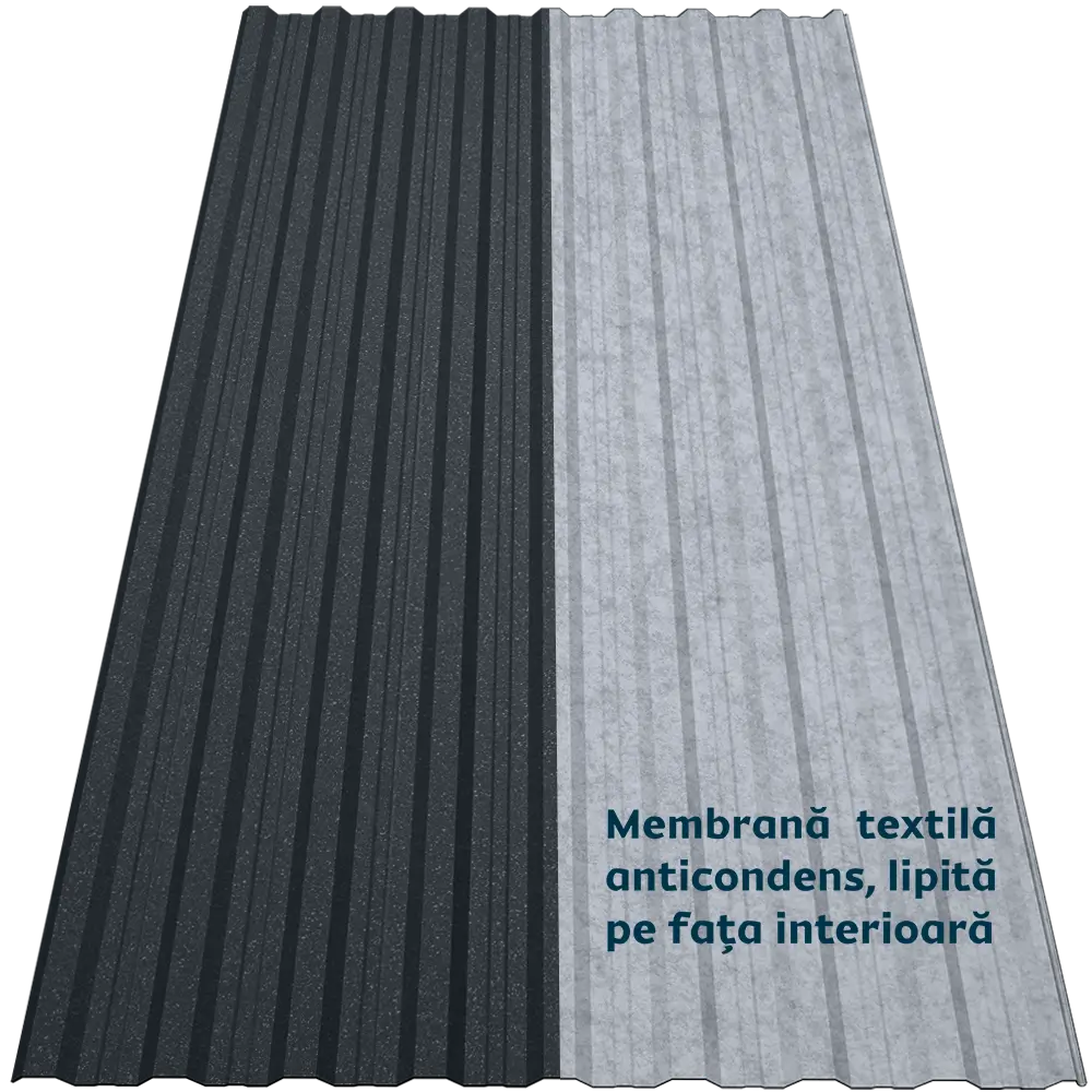 Tabla cutată CRT 18A Smart oferă rigiditate și stabilitate datorită profilului trapezoidal nervurat. Membrana textilă autoadezivă aplicată pe spate funcționează ca o folie anticondens, reținând umezeala și eliminând-o treptat prin evaporare. De asemenea, reduce transferul termic, atenuează zgomotul ploii și oferă protecție suplimentară împotriva incendiilor, bacteriilor și mucegaiului.