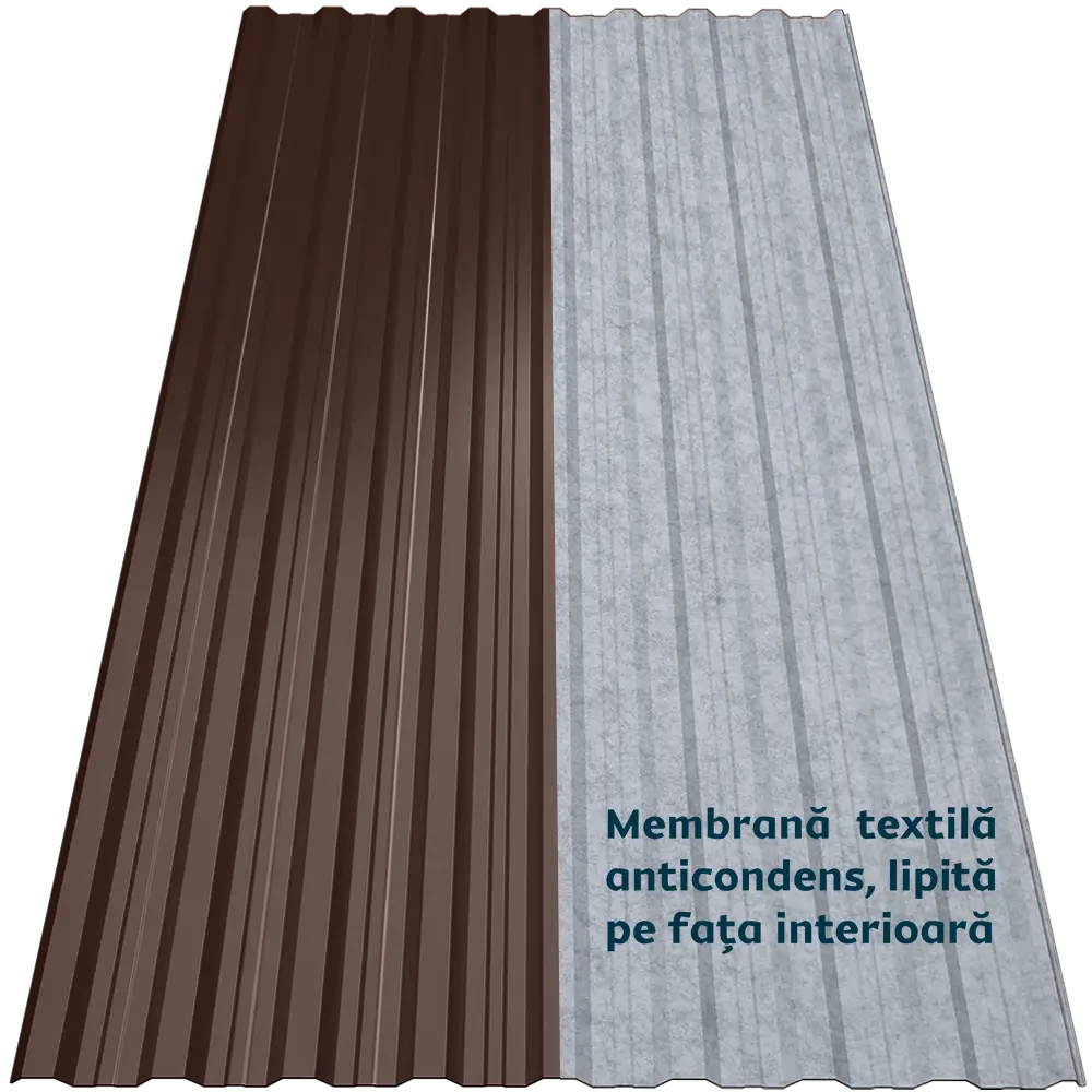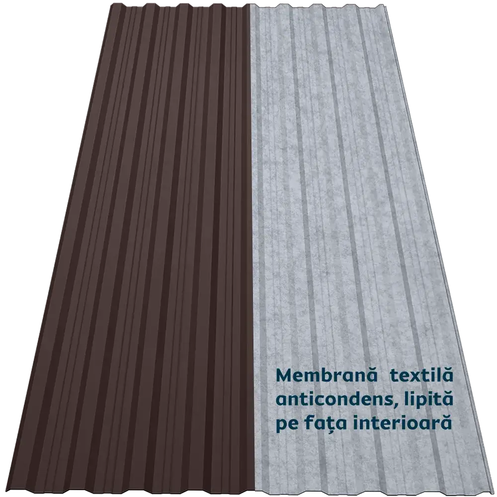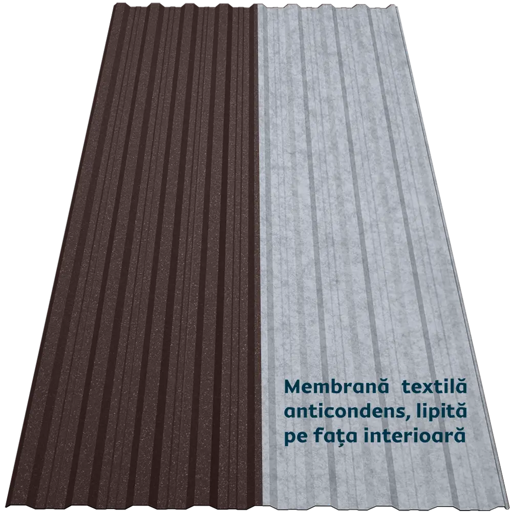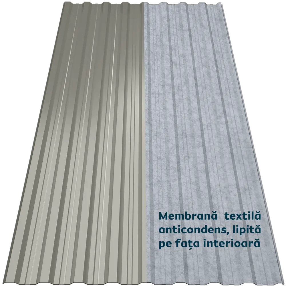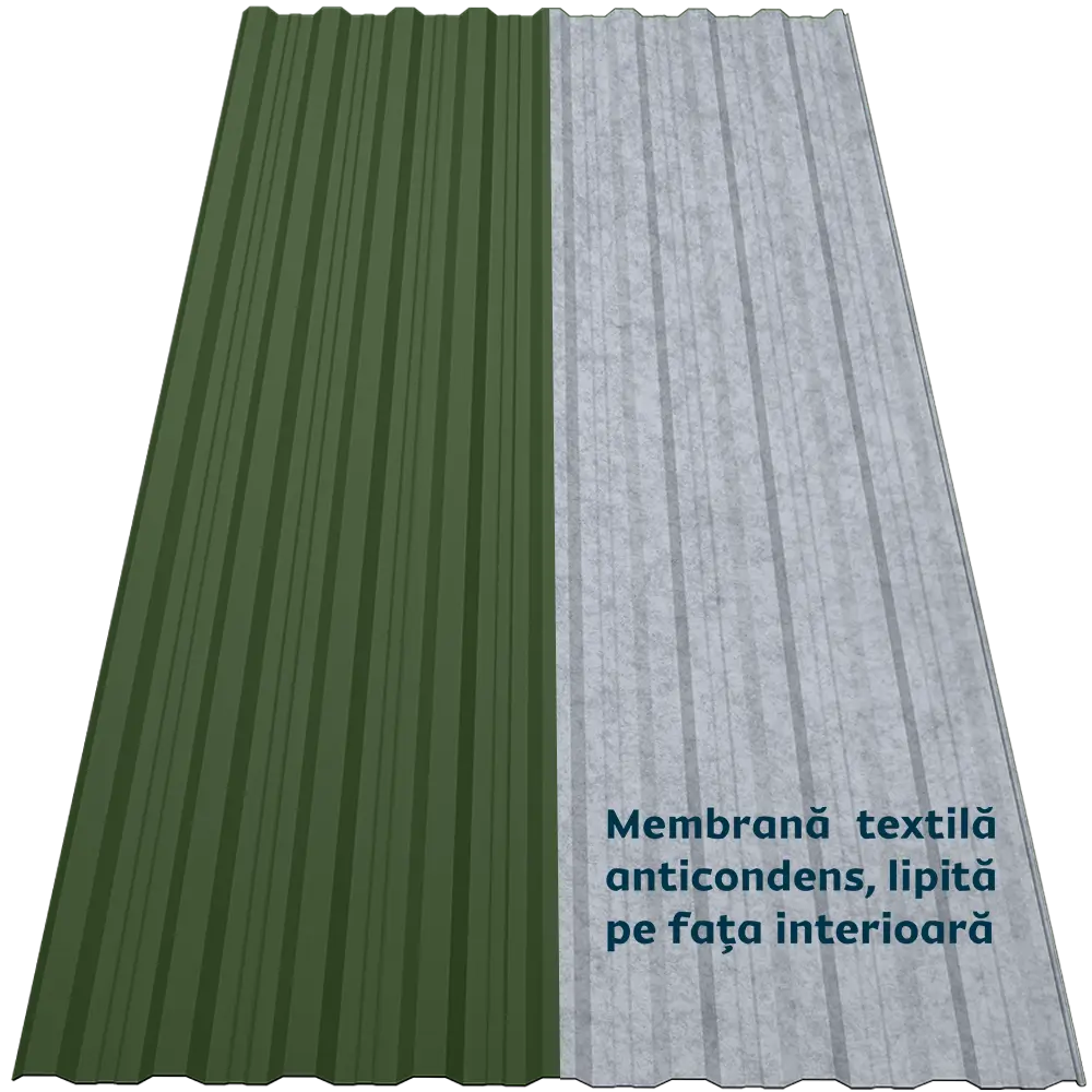 Tabla cutată CRT 18A Smart oferă rigiditate și stabilitate datorită profilului trapezoidal nervurat. Membrana textilă autoadezivă aplicată pe spate funcționează ca o folie anticondens, reținând umezeala și eliminând-o treptat prin evaporare. De asemenea, reduce transferul termic, atenuează zgomotul ploii și oferă protecție suplimentară împotriva incendiilor, bacteriilor și mucegaiului.