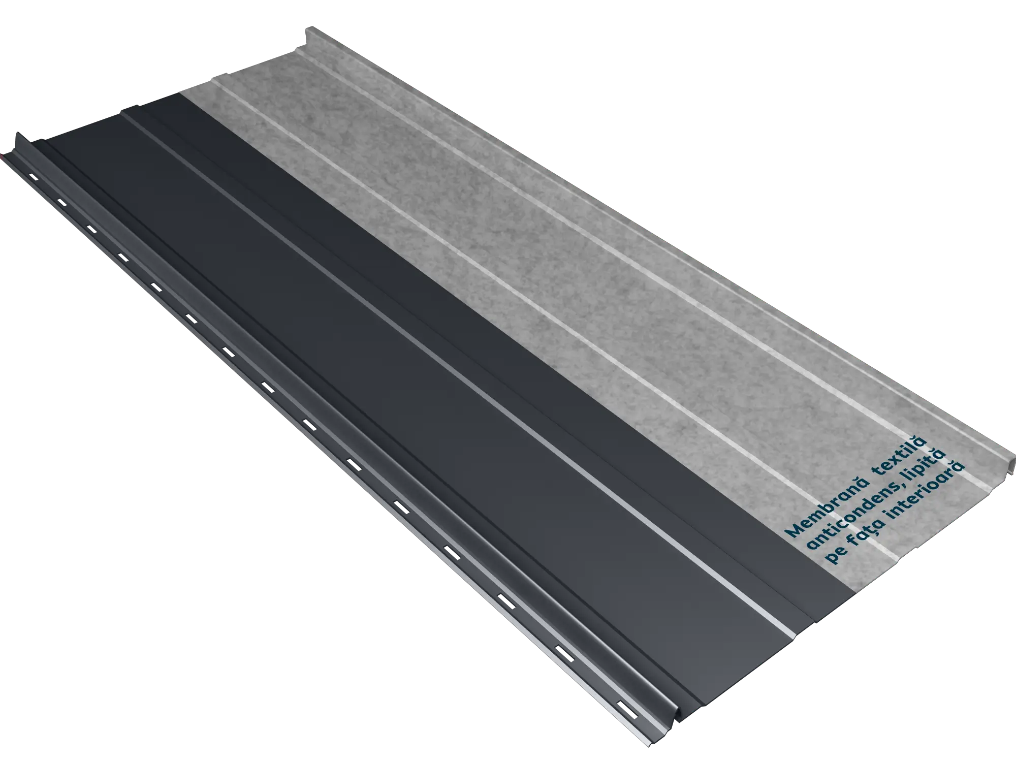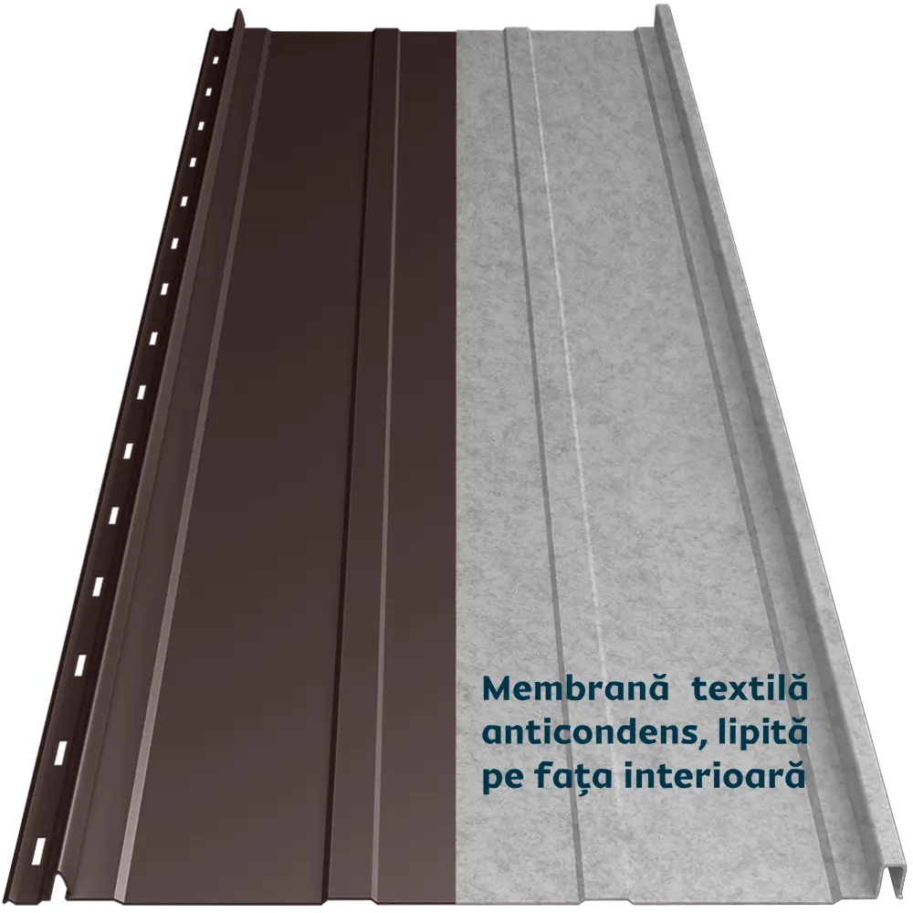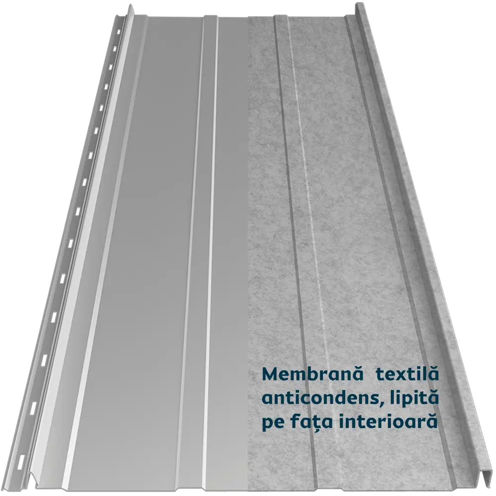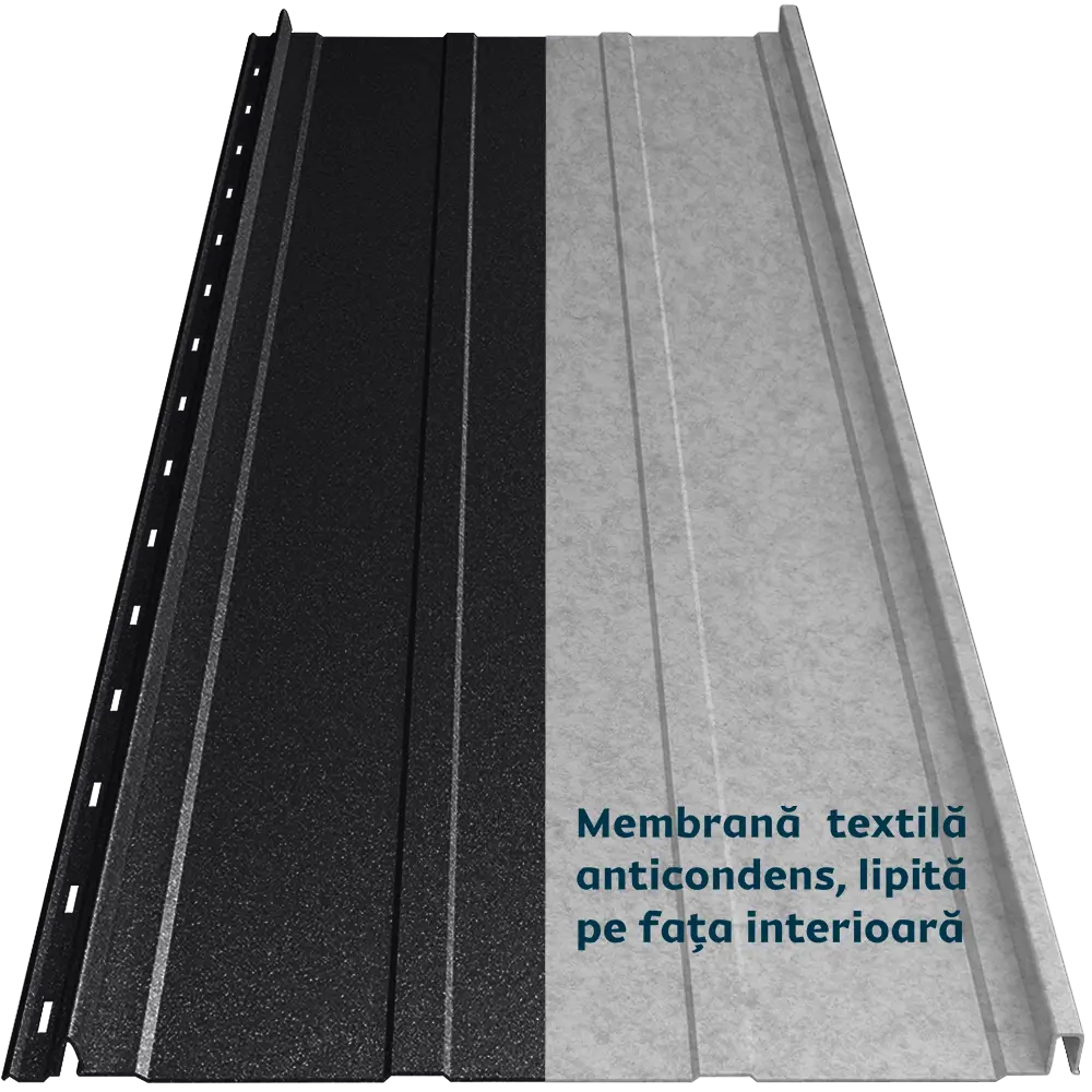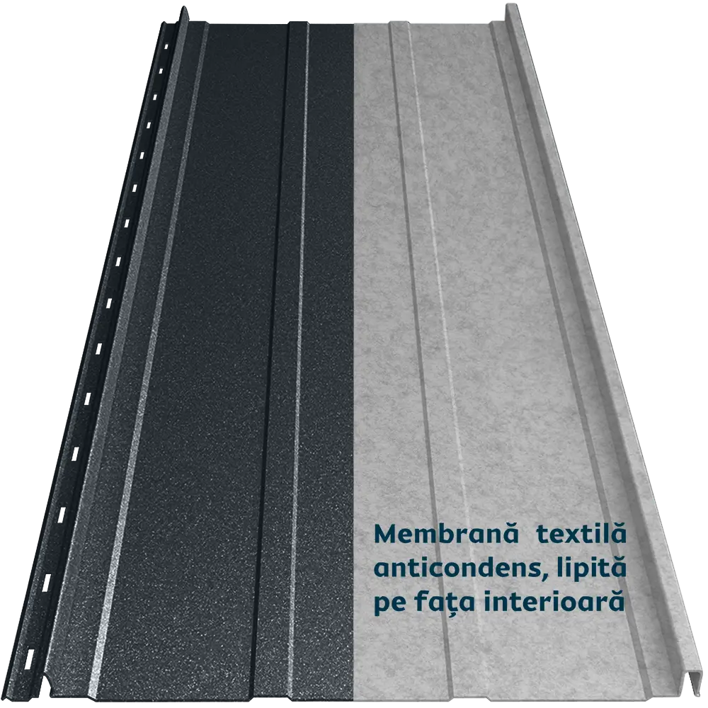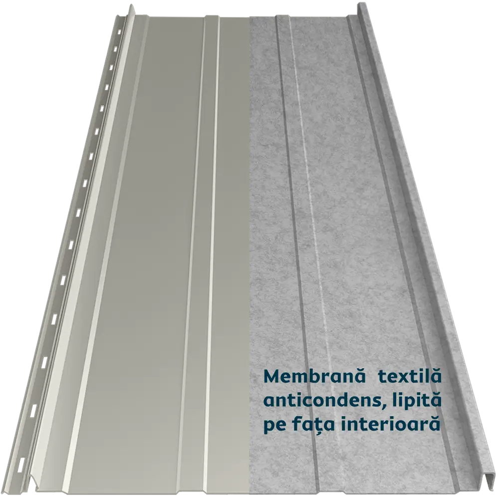 Panoul de tablă prefălțuită Canto Nervurat Smart se distinge prin nervuri longitudinale, care îi oferă rigiditate și un aspect echilibrat. Membrana textilă anticondens aplicată pe spate previne condensul și îmbunătățește confortul termic și fonic al acoperișului. Este ignifugă și tratată antibacterian. Îmbinarea ușoară prin clipsare maschează găurile de prindere pe lemn și face montajul ușor.