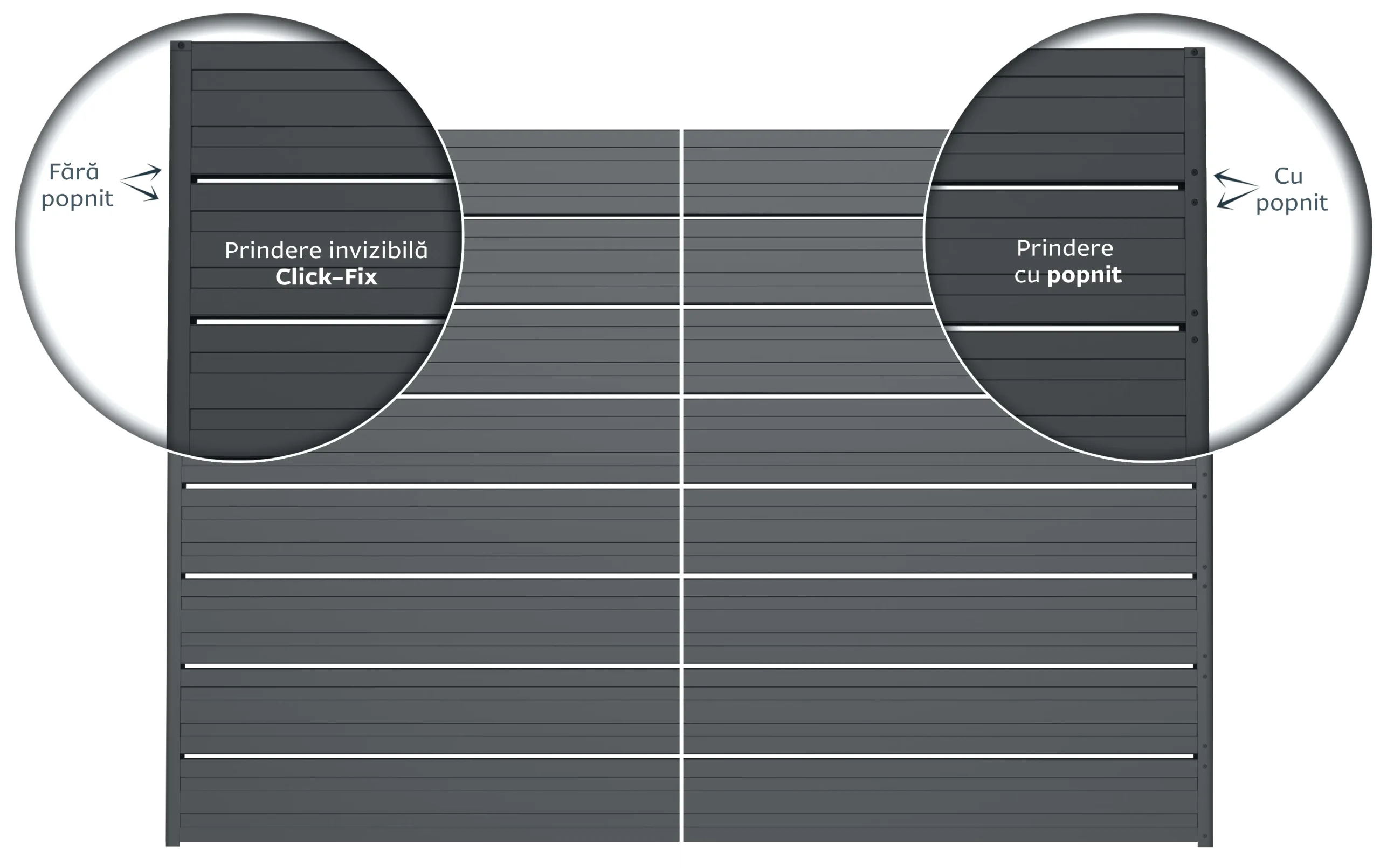 Sistemul de prindere Click-Fix asigură un montaj rapid și ușor, fără elemente vizibile, în timp ce varianta cu popnit oferă o fixare clasică și durabilă.