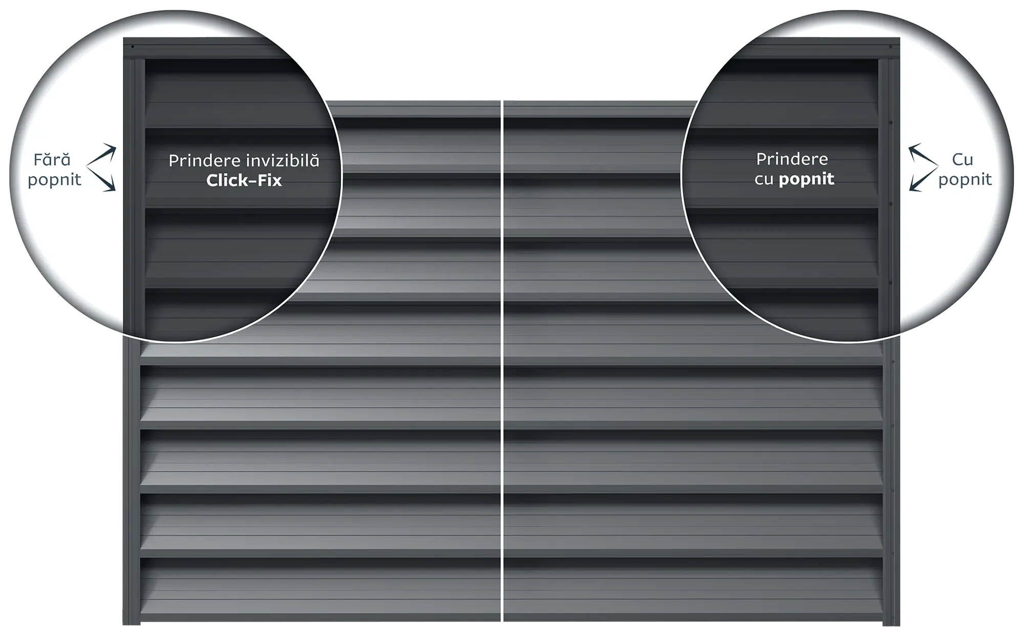 Sistemul Click-Fix este o prindere invizibilă care elimină șuruburile la vedere și permite un montaj rapid, prin glisare. Prinderea cu popnit este o soluție clasică, robustă și rezistentă la vibrații, putând utiliza profile de fixare tip „Omega” sau „U”.